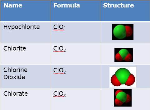 - Chlorate (ClO3-) cũng có thể được sản sinh (phụ thuộc vào điều kiện pH)