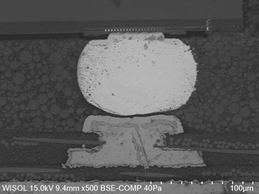 Hình ảnh tổng quan chân linh kiện chụp trên Hitachi SEM SU3500 sau khi được cắt, mài và đánh bóng bằng thiết bị Leica EM TXP