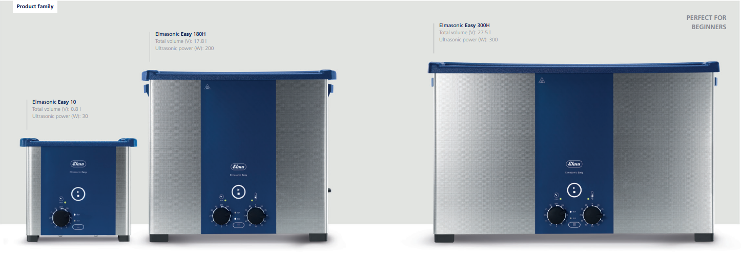 Dòng bể rửa Easy có 14 kích cỡ khác nhau (điện áp 115/230V) với dung tích từ 0,8-30 lít. Đối với bể rửa có dung tích dưới 3 lít, một số loại sẽ không có chế độ gia nhiệt. Tuy nhiên, tất cả các bể có dung tích 3-30 lít đều sẽ có chế độ gia nhiệt. Bên cạnh đó, đối với các dòng bể rửa từ 60H trở đi sẽ có thêm ống xả ở phía sau (không áp dụng cho Easy 50R).