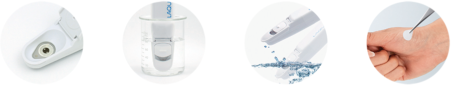 Áp dụng nguyên lý đo tương tự như các điện cực tiêu chuẩn trong phòng thí nghiệm, máy đo LAQUAtwin gói gọn tất cả các thành phần của một điện cực tiêu chuẩn*1 vào trong một cảm biến bán dẫn phẳng có độ dầy chưa đến 1mm. Có thể kiểm tra lượng mẫu nhỏ dạng vết hay các mẫu dạng rắn, dạng bột, và giấy/vải (có chứa ẩm)*2.
