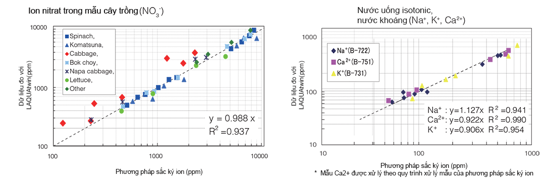Điện cực ion của LAQUAtwin là một điện cực chọn lọc ion có thế điện cực thay đổi theo nồng độ của một loại ion nào đó trong dung dịch. Phương pháp điện cực ion cho kết quả nhanh và tương quan chặt chẽ với kết quả từ phép đo sắc ký ion-tiêu chuẩn vàng trong các phương pháp phân tích (hình minh họa ở dưới)