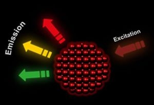 Các chấm lượng tử (QD) là các hạt bán dẫn có kích thước vài nanomét. QD phát ra ánh sáng có bước sóng đặc thù khi một dòng điện được đặt hoặc tiếp xúc với ánh sáng. Bước sóng phát xạ có thể được điều chỉnh bằng cách thay đổi kích thước, hình dạng, vật liệu hoặc bằng cách gia tạp các QD. Các QD nhỏ hơn (2 - 3nm) phát ra ánh sáng ở bước sóng ngắn (vùng phổ xanh lục), trong khi các QD lớn hơn (5 - 6nm) sẽ phát ra ánh sáng ở bước sóng dài hơn (cam, đỏ hoặc hồng ngoại). Thêm nữa, điều này chỉ ra thời gian sống huỳnh quang của các QD cũng liên hệ với kích thước hạt. Trong các chấm lớn hơn, thời gian sống dài hơn do các mức năng lượng có khoảng cách gần nhau hơn, cặp lỗ điện tử dễ bị mắc kẹt. Các hạt nano (NP) cũng có cấu trúc rất nhỏ nhưng lớn hơn các QD, thường dao động từ 8 đến 100 nanomet. Bởi vì điều này, các NP biểu hiện các trạng thái giữa các vật liệu khối đó và các nguyên tử hoặc phân tử. Các NP thường sở hữu các thuộc tính quang học không ngờ vì kích thước của chúng cho phép các hiệu ứng giam lượng tử. Ngoài ra, các lớp giao thoa xung quanh các NP đóng vai trò quan trọng trong tất cả các tính chất vật lý của chúng. Các lớp này thường bao gồm các ion, vật liệu vô cơ hoặc các phân tử hữu cơ. |