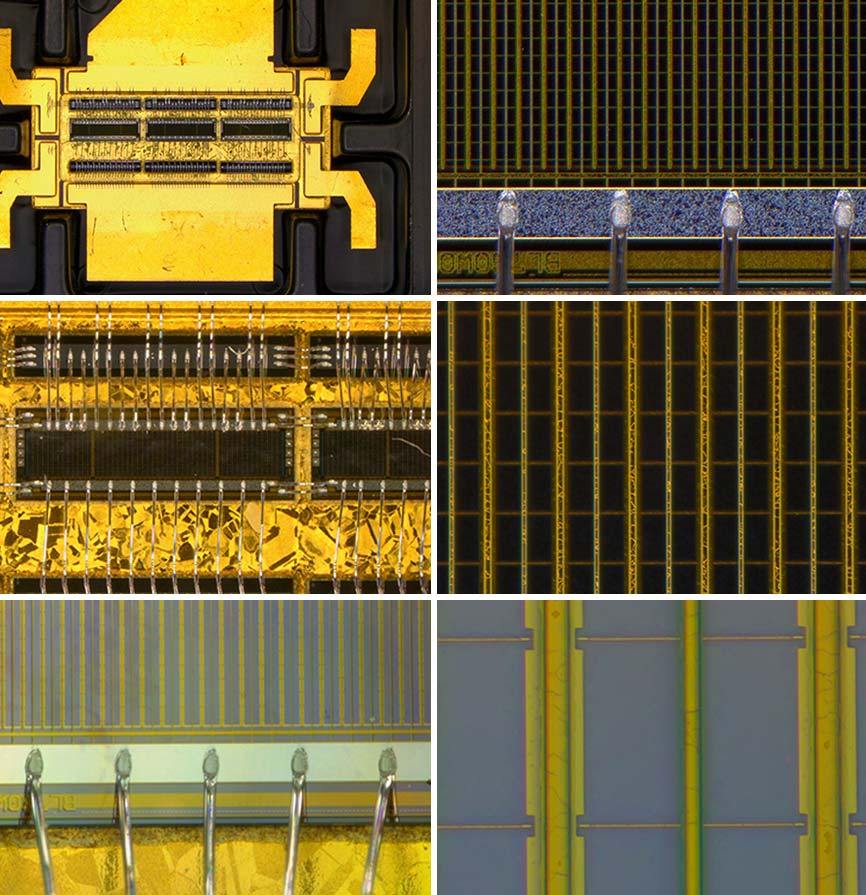 Ảnh mạch điện tử cảm biết chụp với các vật kính phóng đại tầm thấp, trung bình, cao (trên-dưới) ở độ phóng đại thấp nhất và cao nhất (trái-phải).
