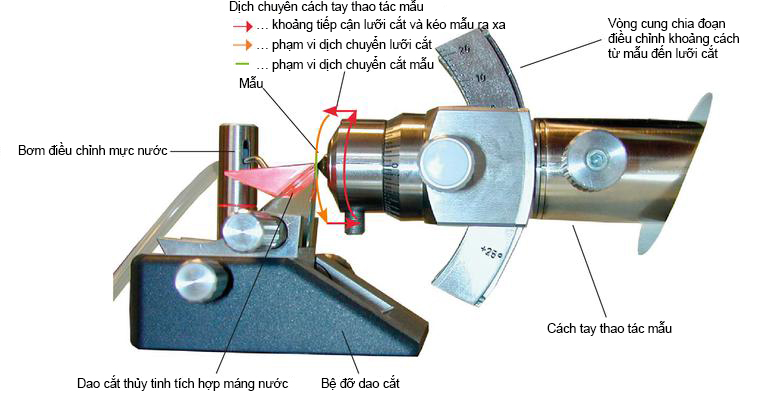 Quá trình cắt lát được thực hiện bằng cách dịch chuyển mẫu theo chiều đứng trên toàn bộ lưỡi dao kim cương hoặc thủy tinh cố định và cực sắc. Việc lấy lát cắc trực tiếp từ lưỡi dao là cực khó vì lát cắt quá mỏng. Do đó, các lát cắt được lấy từ bề mặt nước trong máng nước, sau đó mẫu được quan sát bằng kính hiển vi điện tử truyền qua (TEM). Bên cạnh đó, bề mặt của phần mẫu còn lại sau khi được cắt lát có độ mịn hoàn hảo và có thể sử dụng để quan sát trên kính hiển vi điện tử quét (SEM).