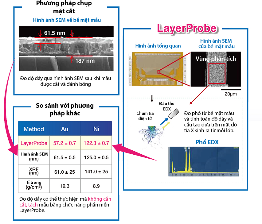 LayerProbe là chức năng phần mềm có thể tính toán độ dầy và thành phần cấu tạo dựa vào mật độ tia X phát nhờ chùm điện tử bắn vào bề mặt mẫu.