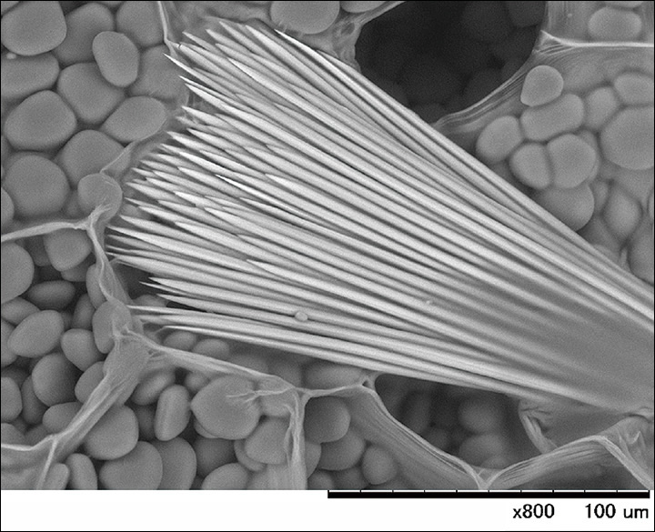 Cross section of Chinese yam cut with a thin knife. TM3030/TM3030Plus can be observed non conductive samples and water contained samples through a low vacuum method without sample preparation. |