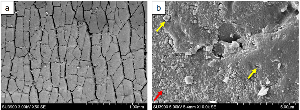 Hình 1 thể hiện hình ảnh của nhựa 20 năm. Các vết nứt rộng với khoảng cách 300 μm được kết nối với nhau bằng mạng lưới các vết nứt hẹp được quan sát trong hình (a). Ở hình ảnh phóng đại (b), bề mặt thô ráp với các hạt lộ ra (mũi tên màu vàng) và đóng cặn có thể được quan sát thấy (mũi tên màu đỏ).