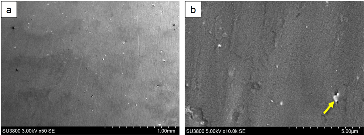 Hình 2: Hình ảnh SEM của bề mặt lớp nhựa mới; (a): 50x, (b): 10 kx, mũi tên vàng: những hạt lộ ra