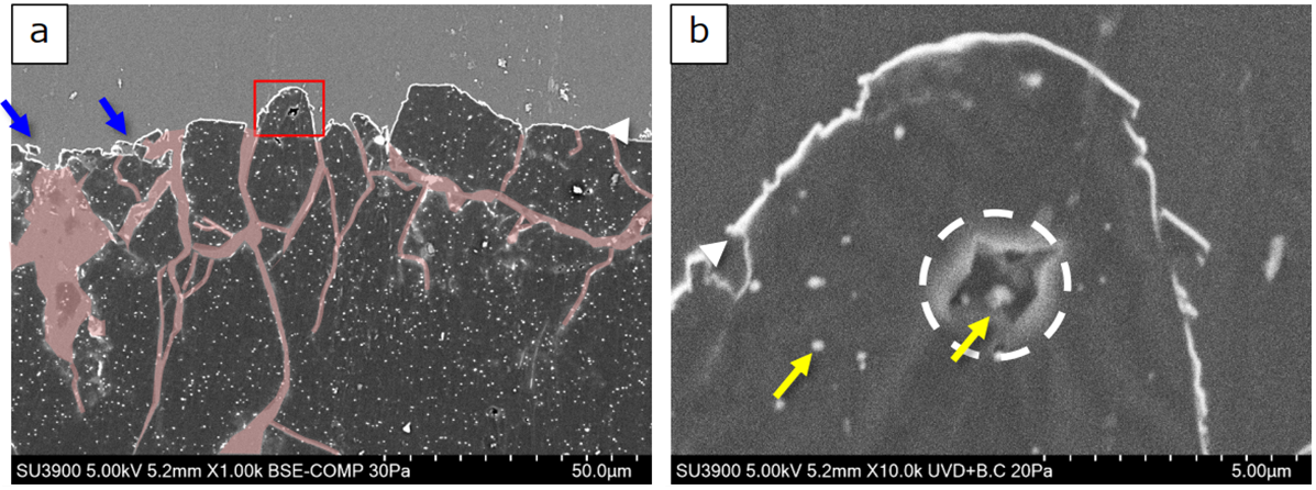 Hình 3 thể hiện mặt cắt của nhựa 20 năm. Những vết nứt được quan sát ở khoảng bên trên xấp xỉ 500 μm từ bề mặt. Ở hình (a), bề mặt gồ ghề với nhiều vết nứt (vùng màu hồng) và quan sát được những phần tách rời (mũi tên màu xanh). Hình (b) là góc nhìn lớn hơn của vùng ô đỏ trong hình (a). Những hạt titan oxit (mũi tên màu vàng) và chỗ trống bị phân hủy nhựa xung quanh hạt titan oxit (vùng khoanh tròn) cũng được quan sát.
