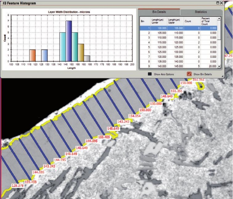 Quá trình phân tích sẽ tự động nhận dạng lớp phủ hay mạ, đo chiều dày của chúng tại nhiều điểm và đưa ra chiều dày trung bình.
