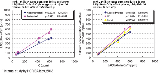 (1) Hình 1 thể hiện tương quan giữa dữ liệu đo được từ LAQUAtwin Ca2+ và từ phương pháp sắc ký ion đối với mẫu đã tiền xử lý và chưa tiền xử lý. Hình 2 thể hiện tương quan giữa dữ liệu đo của LAQUAtwin Ca2+ với các phương pháp khác đối với mẫu đã tiền xử lý. Nước khoáng giàu canxi có chứa canxi sunfat và canxi cacbonat, và chúng được ion hóa qua bước tiền xử lý. Dữ liệu hàm lượng canxi tổng cộng thu được với LAQUAtwin Ca2+ cho thấy sự tương quan tốt hơn so với các phương pháp khác khi mẫu đã được tiền xử lý.