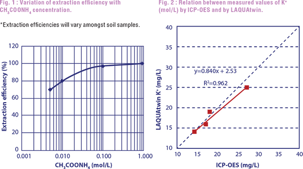 Dựa vào Bảng 1, có thể thấy rằng kết quả đo được bởi LAQUAtwin K+ lớn hơn kết quả của ICP-OES khi sử dụng dung dịch trích CH3COONH4 1 mol/l, do CH3COONH4 bị ảnh hưởng mạnh bởi ion NH+. Tuy nhiên, với dung dịch 0,01 mol/l, thì mặc dù hiệu suất trích ly giảm khoảng 80% (hình 1), nhưng lại thu được tương quan rất tốt (R2 = 0,981 và R2 = 0,962) giữa kết quả thu được từ ICP-OES và từ LAQUAtwin (hình 2).