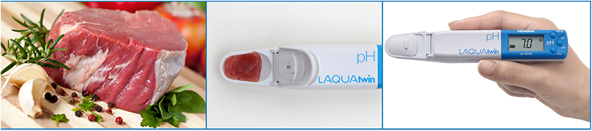 Cắt một mẫu thịt nhỏ và băm nhuyễn để đảm bảo lấy mẫu được đầy đủ cả phần bên trong và bên ngoài của thịt. Đặt mẫu thịt lên cảm biển phẳng của máy đo pH LAQUAtwin và đo. Để kiểm tra mẫu khác, rửa điện cực với nước xà phòng loãng và lau khô.