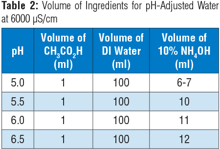 Bảng 1 và 2 thể hiện các hóa chất để điều chỉnh độ pH của nước ở độ dẫn lần lượt là 1000µS/cm và 6000µS/cm. Nếu các dung dịch trong các bảng nói trên cần được chuẩn bị, lấy giá trị thể tích được ghi rõ của acid acetic, nước DI, và amoni hydroxit (NH4OH) cho bước 1 và 2.