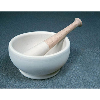 Cối sứ thành dày với đường kính trong 107 mm đi kèm với chày sứ.