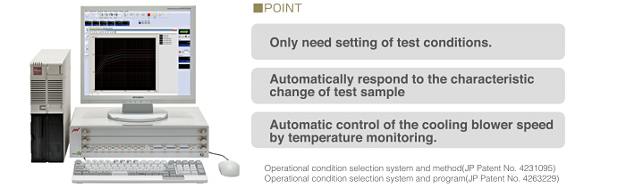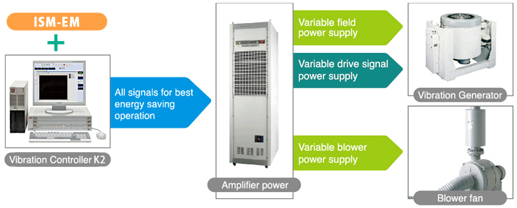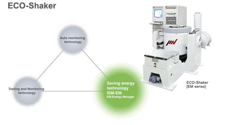 ECO-shaker is a electrodynamic vibration test system which automatically optimize output of power amplifier, power input to vibration and cooling blower rotation speed refering to payload and test conditions. So, complicated manual settings are not needed anymore. Since it is real automatic control according to working environment conditions, "drastic change in output levels due to change of test sample characteristics during the test", "temperature up in system caused by rising heat during operation" etc.. even if those phenomenon happen, it is possible to keep operation without stopping the test.