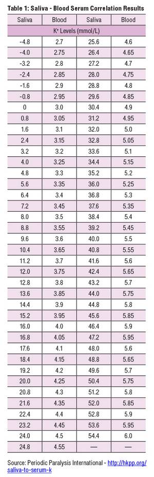 5. Periodic Paralysis International - Saliva to Serum Potassium Concentrations. Retrieved from http://hkpp.org/saliva-to-serum-k on 20 September 2017.