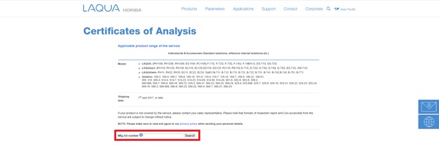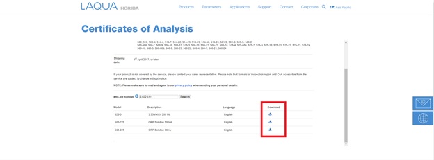 Vui lòng lưu ý rằng chỉ COA cho các dung dịch được sản xuất tại Singapore từ ngày 2 tháng 1 năm 2018 trở đi và báo cáo kiểm thử cho các thiết bị được vận chuyển đến Singapore từ ngày 1 tháng 4 năm 2017 trở đi mới có sẵn trên trang web LAQUA.