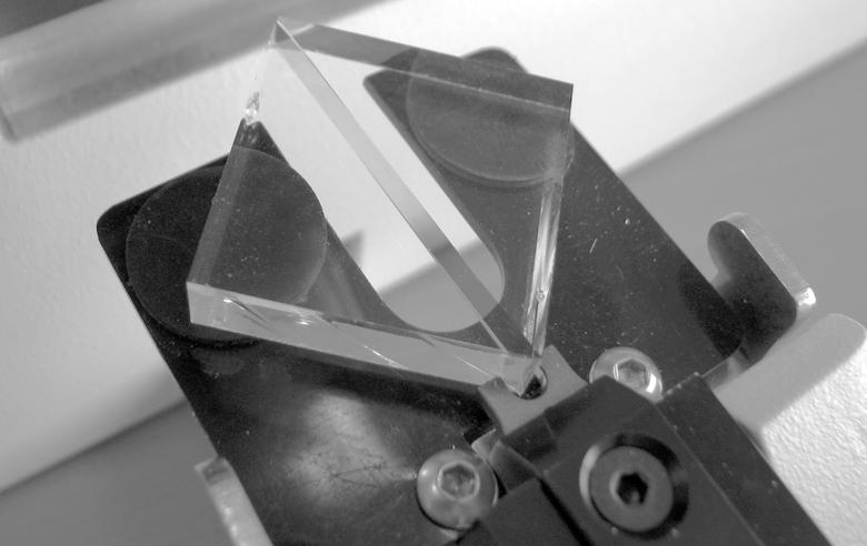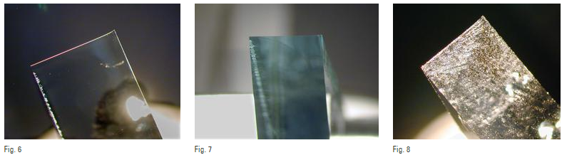 Khi góc dao thủy tinh được kiểm tra dưới trường tối bằng kính hiển vi quang học (hoặc chiếu sáng phía sau trên máy cắt lát siêu mỏng) có thể thấy rằng phần trung tâm là hữu dụng nhất với các ứng dụng cát lát siêu mỏng. Vùng bên phải của góc có răng cưa làm giảm chất lượng của dao và phần bên trái cũng không thích hợp do các đường ép.