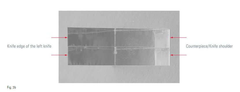 Bằng cách chiếu sáng phía sau và đặt góc mở để tối đa vạch trắng. Ảnh của đường trắng này thể hiện chất lượng của lưỡi dao, yêu cầu phải thẳng, không bụi bẩn, dầu, vân tay và mảnh vụn thủy tinh.