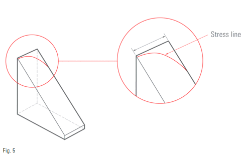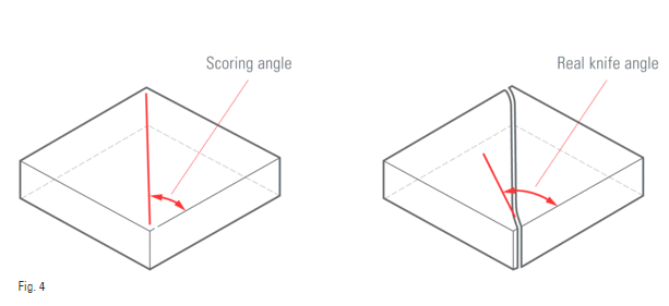 Khi cắt thì vạch cắt dừng lại cách góc một khoảng nào đó. Khi đặt lực dưới vạch cắt, hiện tượng bẻ gãy diễn ra và được xem như sự đào sâu vết cắt. Hiện tượng bẻ gãy hướng tới các góc theo vạch cắt. Khi kết thúc đường cắt thì hiện tượng gãy tự do diễn ra, kết quả bẻ gãy lệch khỏi vạch cắt sẽ tạo thành đường cong tránh khỏi góc, hướng tới một cạnh của hình vuông. Kết quá sẽ dẫn tới góc thực tế lớn hơn một chút so với góc cắt.