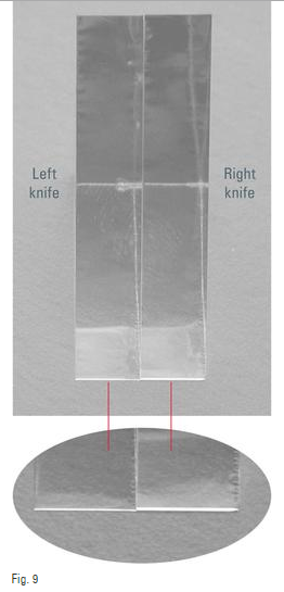 Hình 9 (trên) là một cặp lưỡi dao, được bẻ gãy và đặt cạnh nhau. Hình 9 (dưới) hiển thị chi tiết sống dao của cả hai lưỡi dao. Lưỡi dao trái và phải có sống dao đối diện.