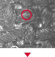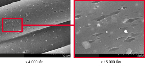 Khi tăng độ phóng đại tới x4.000 lần, vật liệu vô cơ (hạt trắng) đước sử dụng để chặn tia cực tím có thể được nhìn thấy rải rác trong sợi. Lưu ý là ảnh SEM bao gồm ảnh điện tử thứ cấp (bên trên) và điện tử tán xạ ngược (bên dưới). Tăng độ phóng đại lên x15.000 lần, chúng ta có thể quan sát các hạt vô cơ có kích cỡ từ 100nm tới 500nm. Khi quan sát mặt cắt, chúng ta có thể nhận ra cách thức các hạt vô cơ này phân bố trong sợi.