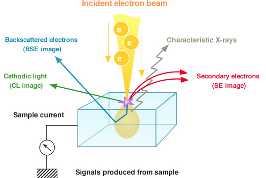 Khi chiếu vào mẫu bằng chùm tia điện tử trong chân không: điện tử thứ cấp (SE), điện tử tán xạ ngược (BSE), tia X đặc trưng, và các tín hiệu khác được hình thành như mô tả ở hình bên trên. Trong kính hiển vi điện tử quét SEM các tín hiệu SE và BSE thường được sử dụng để tạo nên ảnh. Các điện tử thứ cấp SE được sinh ra ở lớp gần bề mặt mẫu, và ảnh SE thu được từ các điện tử này phản ánh chi tiết cấu trúc địa hình mẫu.