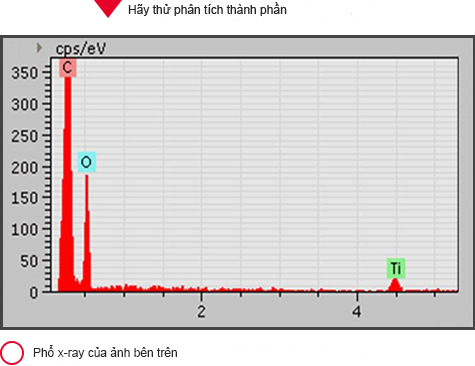 Phổ tia X đặc trưng thu được của vùng quan sát hình chữ nhật trên ảnh BSE bên trên cho thấy mẫu có chưa Ti. Từ ảnh bản đồ nguyên tố của C và Ti thu được từ vùng chữ nhật trên ảnh BSE này, chúng ta thấy vật liệu chủ yếu của mẫu sợi này là thành phần hữu cơ (chủ yếu là C) và các hạt Ti (thực ra là TiO2) có tác dụng ngăn tia cực tím phân bố rải rác trên sợi.