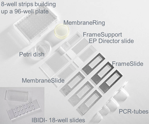 For laser microdissection cells can grow on petri dishes with PEN membrane, stackable membrane rings or multi-well ibidi slides; culture media must be removed (a slight film may remain on the cells) prior dissection. Dissectate of living cell culture can be collected into petri dishes with or without PEN membrane, ibidi slides, stackable membrane rings or 8-stripe tubes for re-cultivation or into collection devices as PCR tube caps or LOC for analysis |
