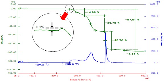 Kết quả phép đo TG-DTA với mẫu HDPE đã cho thấy một đỉnh thu nhiệt do sự nóng chảy ở 126 độ C. Từ 250 độ C, xảy ra một quá trình giảm trọng lượng theo từng bậc do sự ô-xy hóa giảm cấp trong khi trên đồ thị DTA tương ứng có thể quan sát thấy các đỉnh tỏa nhiệt. Trước khi xảy ra quá trình ô-xy hóa giảm cấp, có thể thấy sự tăng trọng lượng khoảng 0.1% do hiện tượng ô-xy hóa bề mặt.
