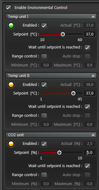Với mô-đun Environmental Control của LAS X, bạn có thể theo dõi các điều kiện nhiệt độ, CO2 và O2 mọi lúc. Tất cả các tham số môi trường được kết hợp trong một giao diện, giúp bạn dễ dàng theo dõi chúng trong suốt thí nghiệm của mình. |