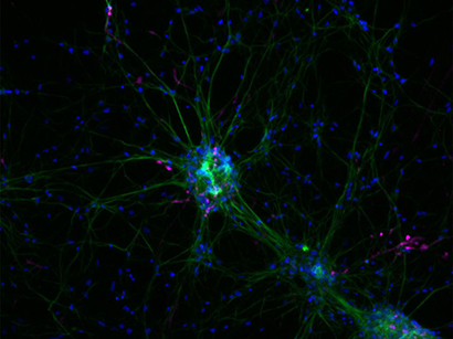 Fluorescence microscopy enables imaging of distinct proteins. Here: Nestin (green), Doublecortin (pink), nuclei (blue)