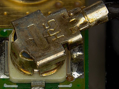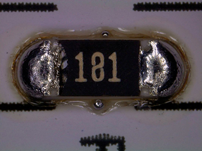 Zoom-in on the soldered ends of a resistor with ring light illumination and a diffusor to reduce glare
