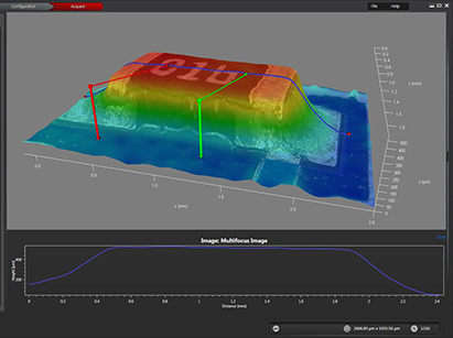 LAS X screenshot showing a 3D typography and measurements in the height profile