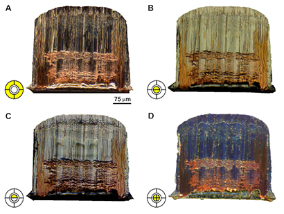 Four views on the cross sections of a Sn-plated copper leadframe with different contrasting options