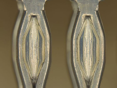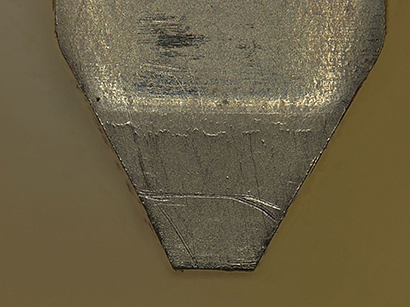 Zoom-in on the tip of a press fit contact pin of a PCB