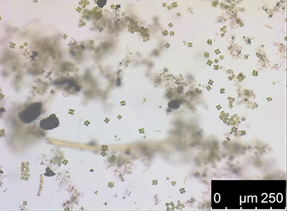 Pond water with algae and diatoms captured with transmitted light.