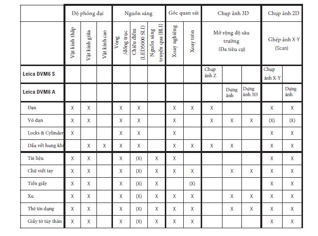 Bảng tóm tắt thể hiện tính năng nào của kính hiển vi Leica DVM6 thích hợp với việc phân tích hình sự nào{9]. X có nghĩa là có ích và (X) có nghĩa tác dụng tương đối.