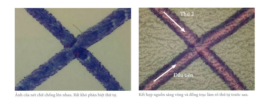 Để giám định được thứ tự của nét viết là một trong những vấn đề khó khăn nhất trong giám định hình sự tài liệu. Hiện nay không có phương pháp tiêu chuẩn cho việc phân tích này. Để phân biệt nét chữ nào viết trước và viết sau trong tài liệu. kính hiển vi Leica DVM6 mang lại giải pháp dễ dàng và đáng tin cậy cho việc kiểm tra dấu và chữ viết chồng lên nhau trong tài liệu.