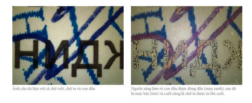 Với nhiều loại nguồn sáng tích hợp như là nguồn sáng vòng và nguồn sáng đồng trục, người dùng có thể phân biệt rõ ràng và nhanh chóng thứ tự chữ viết có trong tài liệu. Nguồn sáng cho phép phân biệt các nét bên trên hay dưới chữ in, con dấu; con dấu bên dưới hay trên chữ in. Hơn nữa, xoay nghiêng đầu quan sát giúp người dùng quan sát tài liệu từ nhiều góc.