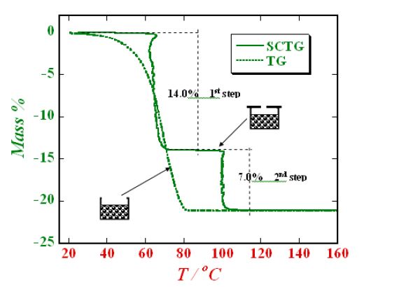 Một so sánh giữa hai đường cong TG được đo bằng các phương pháp khác nhau được hiển thị trong Hình.1. Từ đĩa mẫu không nắp, phép đo TG( đường nét đứt) không thể quan sát được sự khác biệt của trạng thái liên kết, tương ứng với 3 phân tử benzen nhưng chỉ được biểu diễn trong 1 đường giảm khối lượng.