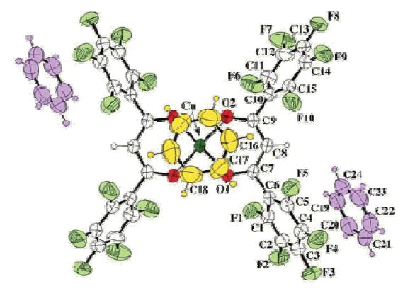 Hình 2: Cấu trúc ORTEP của đơn tinh thể Cu(II) fluorine-substituted β -diketonate complex・3C6H6