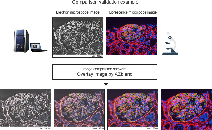 Image comparison software, Azblend (Option), enables to overlay electron microscope image and fluorescence microscope image and results to obtain new information on the specimens. After overlaid image is created, detailed position can be checked with changing transmittance ratio. An aimed position is to be determined with an image of fluorescence microscope then detailed share of the same position can be observed with an image of electron microscope. Furthermore, it enables to overlay with other microscope images or CAD data.