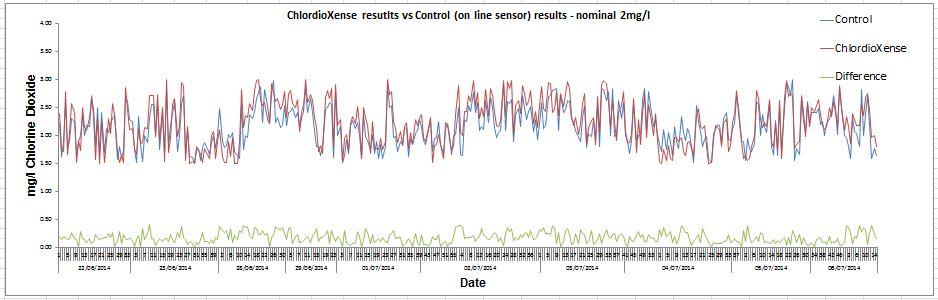 Tương quan giữa đầu dò trực tuyến và ChlordioXense™ rất tốt. Giá trị chênh lệch giữa hai phương pháp đo là 0,4mg/L được đặt làm giới hạn để ngừng sản xuất. ChlordioXense™ đã được chứng minh là một phương pháp đơn giản và đáng tin cậy để đảm bảo liều khử trùng bằng clo dioxide.