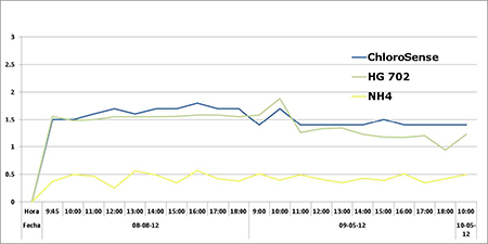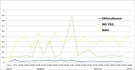 Các kết quả của ChloroSense cho thấy hiệu ứng nhiễu breakthrough không ảnh hưởng với các hóa học được sử dụng trên cảm biến. Dư lượng Clo tự do dưới 0.05mg / l trong suốt thời gian thử nghiệm hai ngày. Tổng Clo của thiết bị ChloroSense trùng với các kết quả trên máy phân tích.