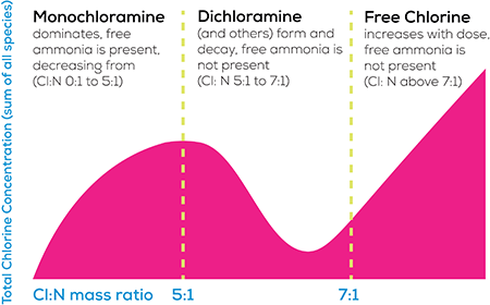 Với hàm lượng ammonium (NH4) và clo tự do cao được đưa vào mạng lưới, ta mong đợi sẽ nhìn thấy dư lượng clo tự do ít và tổng lượng Clo khoảng 1,5 mg / L. Phương pháp DPD trực rất vất vả để theo dõi dư lượng Clo tự do trong khi hoạt động khá tốt khi kiểm tra tổng Clo.