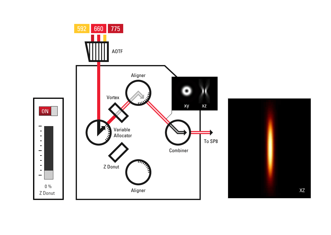 With TCS SP8 STED 3X, two light paths are available at the instrument that generate different STED patterns. The vortex phase mask creates the classic STED donut which improves resolution only in x and y. A second light path with a different phase mask forms the z donut that increases resolution also in z. STED light can be steplessly distributed between the two paths. Engineer your PSF