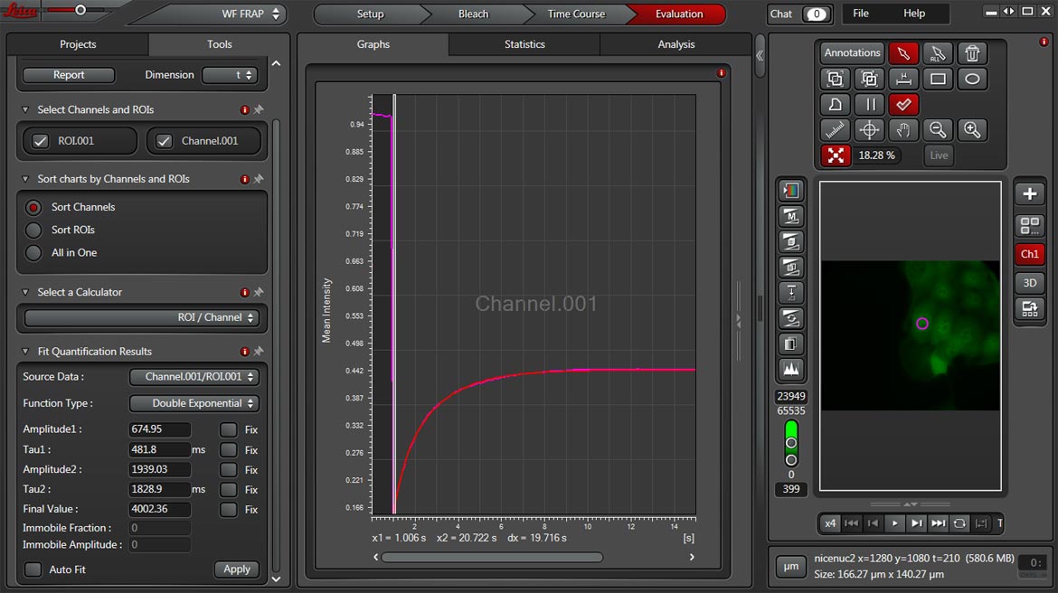 Bắt đầu hệ thống của bạnThiết lập thí nghiệm của bạn không thể dễ dàng hơn với trình hướng dẫn WF FRAP trong Phần mềm Leica LAS X. Với việc kiểm soát công suất laser, thời lượng xung và các thông số thời gian, bạn có thể tìm thấy các điều kiện phù hợp để xem kết quả chiếu sáng.