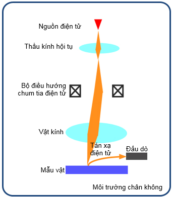 ● Chùm tia điện tử được phát ra và gia tốc bởi một nguồn phát điện tử ● Thấu kính hội tụ điều khiển dòng đầu dò và góc phát xạ ● Vật kính hội tụ chùm tia trên bề mặt mẫu ● Đầu dò có chức năng thu tín hiệu điện tử phát xạ Do vị trí phát xạ được dịch chuyển bởi bộ điều hướng nên mức độ phân bố cường độ phát xạ điện tử được thu và tạo ra hình ảnh. |